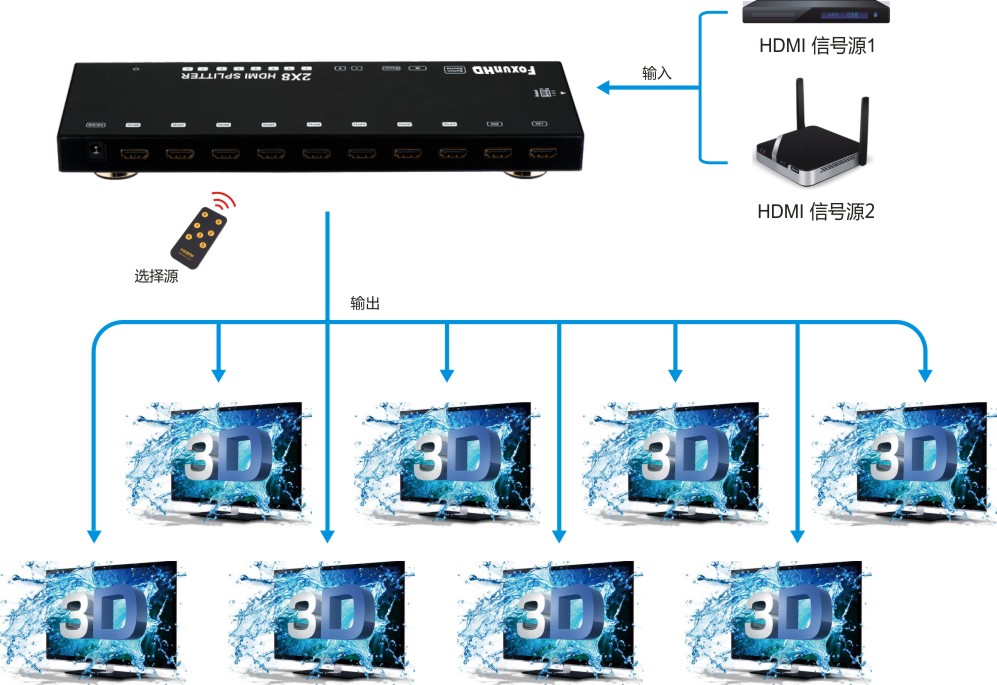 1) 选择两种不同的HDMI信号输入设备同时切换至八台HDMI显示设备上