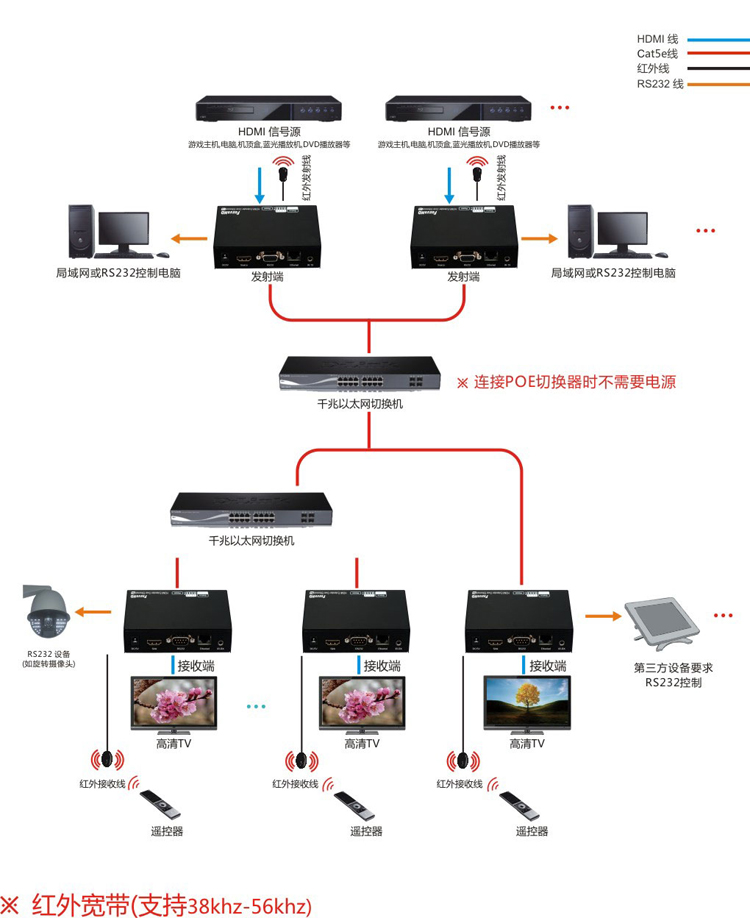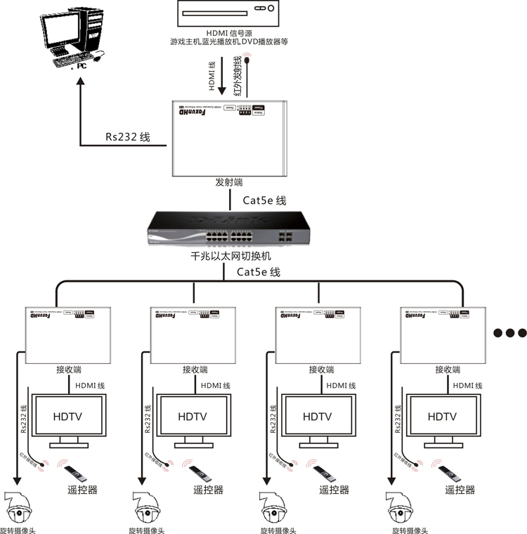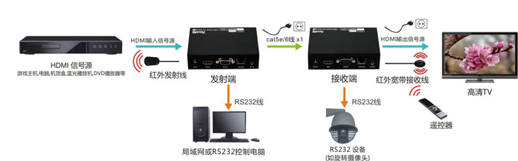 4) 延伸1080p HDMI 信号达到120m 通过一条Cat5e/6 线缆