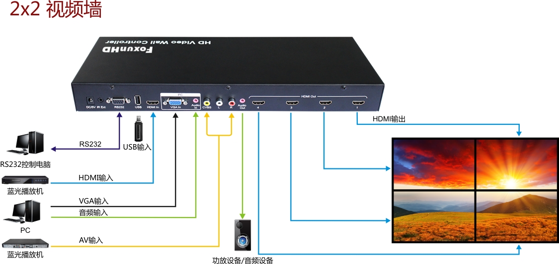 1)四画面拼接处理功能:2X2视频墙,任选一路信号分割成四个部分到四路HDMI输出组成一副完整的画面